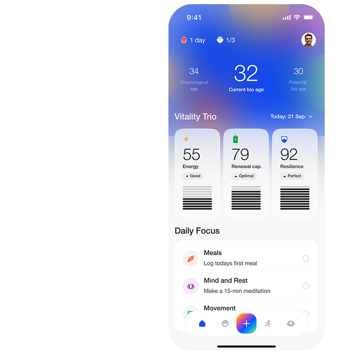 Using research from epigenetic studies and evidence-based lifestyle intervention protocols, we calculate your true biological age and ageing velocity.